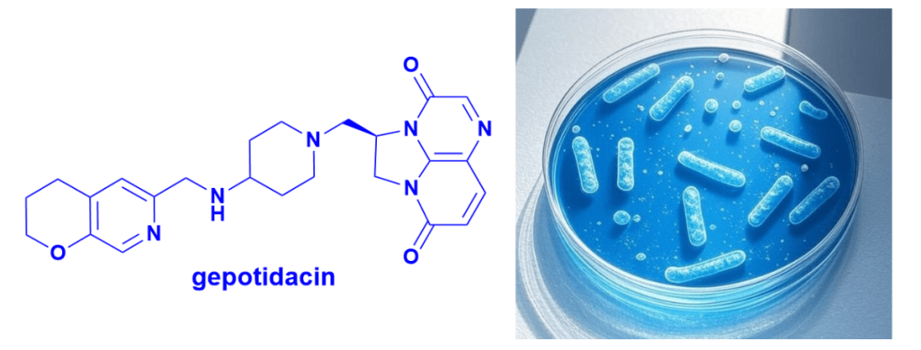 Structure of gepotidacin and a stylised a petri dish (created by Grok), highlighting its role as a new treatment for uncomplicated urinary tract infections.